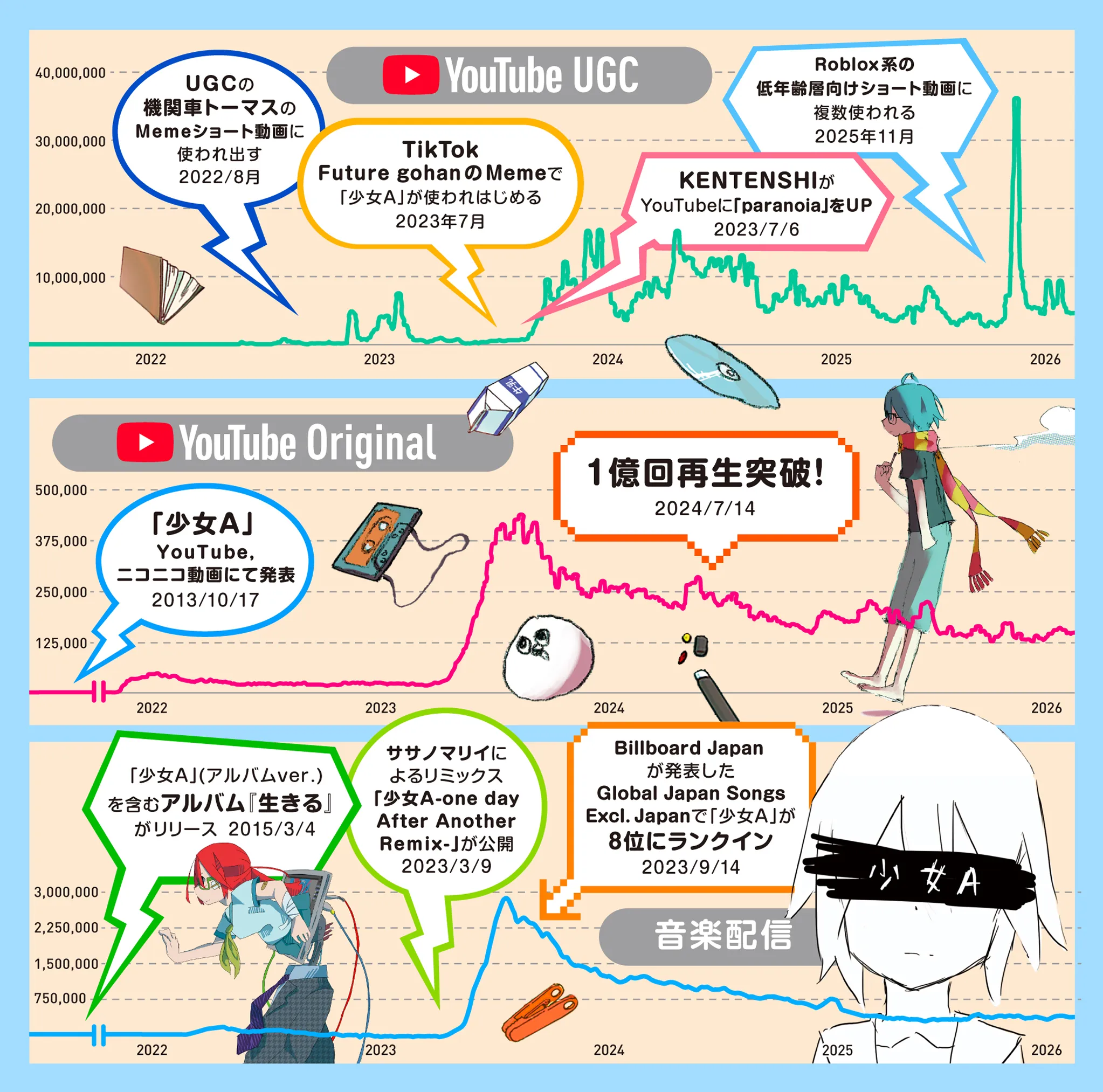 そんななか、「少女A」が世界的にバイラルし、公式配信およびUGCを含む累計再生数は75億回を超える再生数を記録。全ボカロ楽曲のなかで最も聴かれている楽曲になったという事実に、喜びと驚きが入り混じりながら、どこか遠くの出来事を眺めているような、「そうらしい」という気配だけがあるのもまた事実です。